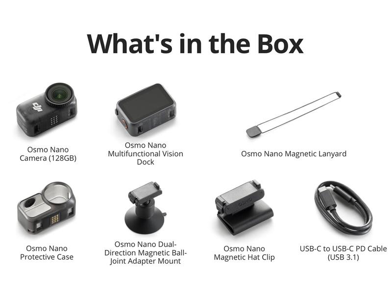 | note | Contenuto della confezione: Fotocamera x 1 Dock di visione multifunzione x 1 Clip magnetica per cappello x 1 Cordino magnetico x 1 Custodia protettiva x 1 Cavo PD (USB 3.1) x 1 Adattatore magnetico con supporto a doppio asse e testa sferica x 1 |