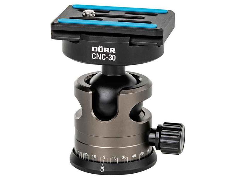 | TESTA | Dorr CNC 30 testa a sfera con piastra a sgancio rapido tipo Arca Swiss ( 39 x 54 mm) materiale : alluminio colorato in Titanio Scala panoramica Bolla a livella Controllo frizionato Blocco di sicurezza contro le cadute accidentali Diametro sfera : 30 mm portata 6 kg Nuovo design con sfera a vista e chiusura a leva testa rimovibile: compatibili altre teste con innesto da 14/" e 3/8" |