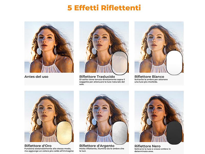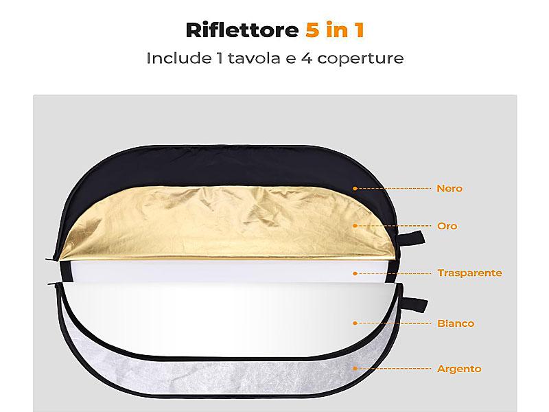 | NOTE 2 | l riflettore 5 in 1 include un pannello traslucido con rivestimento in quattro colori per fornire cinque effetti fotografici, anziché il trasporto di cinque riflettori separati. Sacca di trasporto inclusa. |