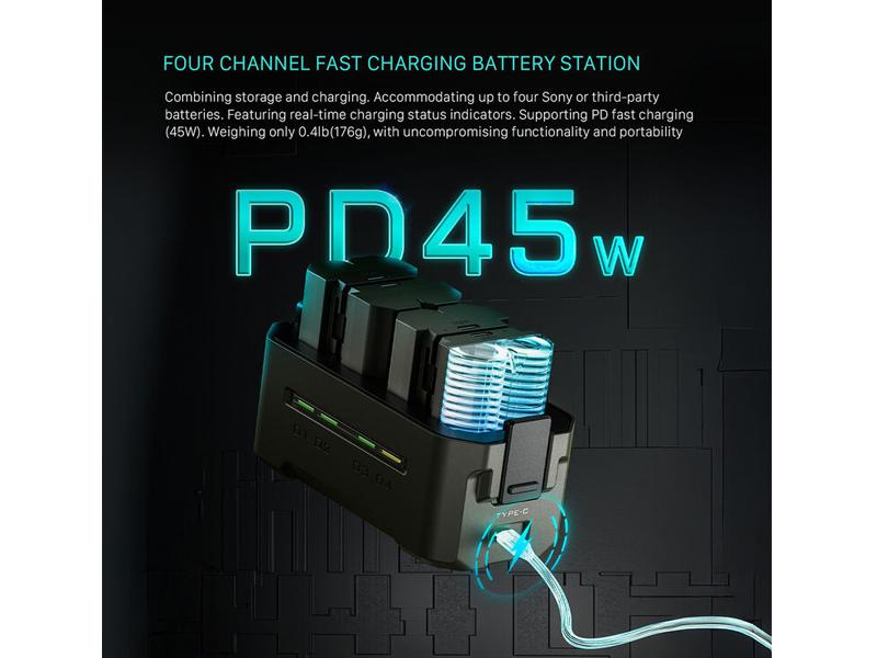| caratteristiche | Compatibilità batterie: Sony NP-FZ100 Numero di alloggiamenti: 4 Modalità di ricarica: Simultanea Alimentazione: USB (cavo incluso) Ingresso di alimentazione: 1 × USB-C Adattatore / cavo incluso: 1 × cavo USB-B maschio → USB-C femmina Tempo di ricarica: circa 3 ore Indicatori di stato: LED |